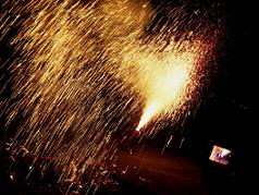 こんにちは。水曜日担当のしんのすけ侍です。昨日、今日と2日間、隣の片瀬温泉では恒例の夏花火大会『炎艶美(たちえんび)』が行われました。花火といっても、良くある打ち上げ花火とは一味違う手筒花火が中心となります。海岸にて5m以上も炎を吹き上げる花火の筒を人間が直に持って、大量の火の粉を振りまけながら観客に披露してくれます。打ち上げ花火のような色鮮やかな華美さはありませんが、海岸目の前で観賞するのであれば、手筒から勢いよく吹き上げられるオレンジ一色の大量の火の粉は迫力あって圧倒されます。熱川の海岸通りを平行に徒歩約10分足らずで会場まで着くことができますので、是非来年は熱川温泉に泊まって花火をご観賞いただければとお勧めいたします。辺りは真っ暗ですが、星空と月や漁り火、正面の伊豆大島の明かりを見ながらの海岸ウォークもなかなか乙なものですよ。
