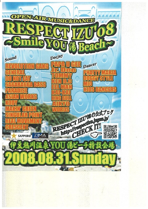今年も熱川の夏の風物詩の1つでもあります「Respect IZU "Smile You 湯 Beach"」が開催されます.【日時】2008/08/31(SUN) 11:30~19:30,【会場】熱川 You 湯 Beach 特設会場例年と違うのは昼の開催ですのでお気をつけください.出演 Deejay&Sound&Dancer 発表!!Deejay & Singer PAPA U-Gee Jr.DEE TOMMY KEN B.C EELMAN KAI-KAI KING BULLAIKYO WORDS SoundREVOLUTION GANG GENERAL CREW DO NOT EAT SAGARAGGA BASS PARADISE ASIAN WORKSKODY MAKIN GREEN SINGULAR POINT REAL MOVEMENT with SOUNDSYSTEM CRESCENT with SOUNDSYSTEMDancerPHATTY MARIA DOGGY STYLE MIO + Juicy KIDS DANCERS etcさらに詳しい紹介は「Respect IZU Offical Blog」をご覧ください!熱川温泉へのお泊りは「YAHOOオークション」で落札を!