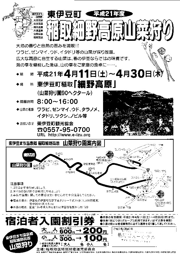 稲取細野高原の山菜狩りが始まりました.期間はH21.4/11(土)~4/30(木)で営業時間は8:00~16:00までです.料金は一般:大人(中学生以上)600円・小人(小学生)300円です.場所は稲取細野高原山菜狩園(稲取温泉)で伊豆稲取駅よりタクシーで15分です.山焼きをやっているため汚れてもいい服装や山歩きをしますので革靴やハイヒール等は不可です.ご宿泊の旅館に上記のチラシをおいてありますので,熱川温泉にご宿泊のお客様は大人200円お子様100円にてご入園いただけます.是非この機会に新鮮な「わらび・ぜんまい・たらのめ・いたどり・つくし等」お採りください.