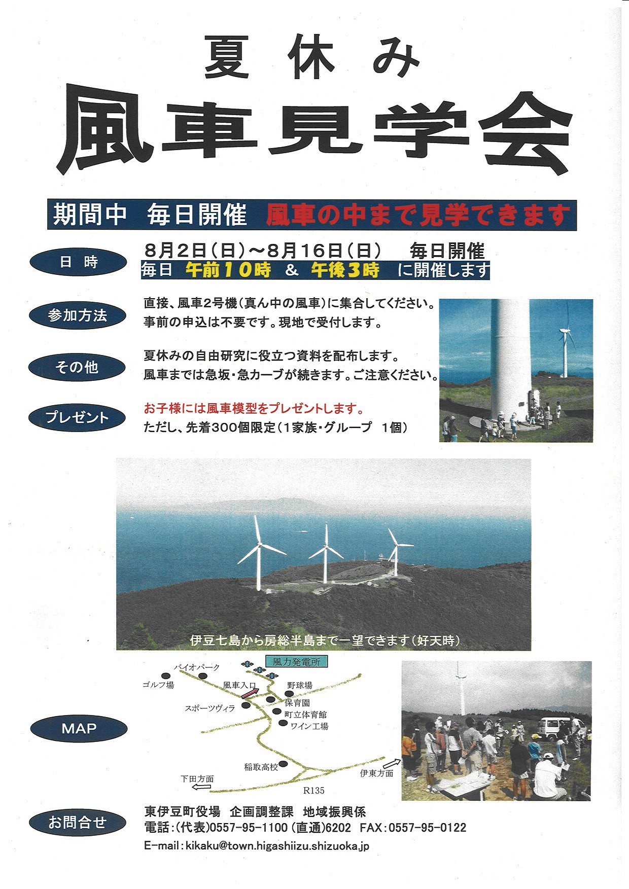8月2日(日)から8/16(日)までの毎日東伊豆町主催の風車見学会がかいさいされています。時間は午前10時と午後3時の2回開催されます。ただいま特にエコで注目をあつめています風力発電の風車を間近にごらんいただけます。お子様の夏休みの自由研究に役立つ資料も配布されます。是非この機会に時代の最先端の技術に触れてみては如何ですか?場所は熱川温泉からお車で約15分です。