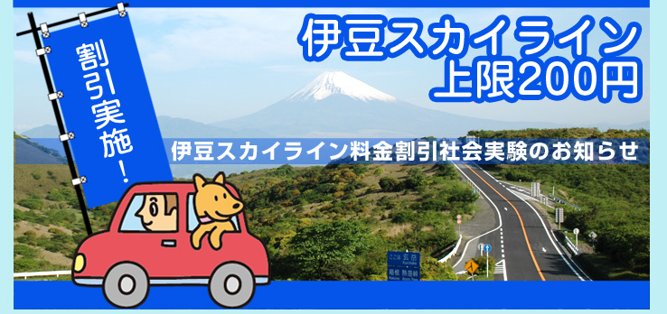 今現在,伊豆スカイラインの通行料金が期間限定で上限200円となっています。実施期間:平成21年11月1日から平成23年3月31日の毎日です。とくに東名高速道路の沼津ICを経由される方は,沼津ICの出口右側に、伊豆縦貫道・伊豆方面(無料)への入口があります。約10分で国道1号線・三島塚原出口につきます。左折して箱根方面に向かうと、15分くらいで箱根峠に到着です。右折して15分も走り十国峠をこえると、伊豆スカイラインの入口が見えてきます。沼津IC-(約10分)ー三島塚原出口を左折ー(約15分)ー箱根峠を右折ー(約20分)ー伊豆スカイライン入口-伊豆スカイライン(熱海峠IC)に入ります。11月1日から2011年3月末まで上限200円(普通車・大型車)という嬉しい割引が実施されています。沼津ICから伊豆縦貫自動車道、伊豆スカイラインを走り、亀石峠ICをおりて下っていくと伊東・宇佐美地区、冷川ICをおりて中伊豆バイパス(無料)を利用していくと松川湖・伊東市街地、終点天城高原ICまで行き下っていくと大室山・伊豆高原です。熱川温泉へはこの新ルートがお奨めです。