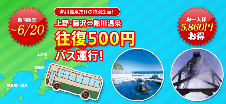 今月の20日から熱川温泉におきまして,とてつもない企画が動き出しています.まずは5/20から熱川温泉の山の手の「けやき公園」におきまして,ほたる鑑賞の夕べを開催しております.これは6/3までつづきまして,6/4からは恒例の「大川温泉ほたる鑑賞の夕べ」が6/20までつづきます.この1ヶ月は「ほたる三昧」でお楽しみいただけます.またこのイベントにあわせまして熱川温泉の旅館にお泊りのお客様は東京の上野駅と横浜駅から特別価格でバスを御利用いただけます.運賃は往復でお一人@500円です.通常ですと東京と熱川を往復しますと6360円のところ500円で往復いただけます.期間は5/20から6/20の限定ですがこの機会に是非お得なバスをご利用ください.詳しくは「熱川温泉」のHPで!