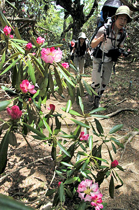 これからの季節はハイキングがお薦めです。特に天城山系の最高峰である万三郎岳(1405・3メートル)などで、天城シャクナゲが満開を迎えています。縦走路の石楠立(はなだて)から万三郎岳のほか、万三郎岳下分岐点から涸沢(からさわ)にかけても多くの自生種が見られます。つぼみは色が濃く、花は薄ピンク色や白色でとても美しく咲きほこつています。お車では国道135号線の道の駅「グランパル公園」の信号を左折して伊豆スカイライン天城高原終点出口を見ながら更に天城高原ゴルフ場を目指します。石作りの柱の先に登山者用駐車場(100台収容トイレ有り)がございます。列車では伊東駅から東海バスの天城高原ゴルフ場行(土・日・祝)が運行しています。伊東駅からタクシーご利用の場合は約45分です。 天城高原ゴルフ場→万二郎岳(1時間)、万二郎岳→万三郎岳(1時間15分)、万三郎岳→天城高原ゴルフ場(2時間)、休憩も入れて5時間余りの中級者向けコースです。海抜1000mを超えているので涼気が感じられ快適な山歩きと評判です。