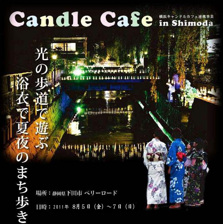 8月5日(金)~7日(日)「キャンドルカフェin下田&ゆかた祭り」が開催されます。開催時間:18:00~21:30予備日:雨天中止料金:無料駐車場:街中の駐車場(有料)を紹介しています。下田の夏夜のイベントです。ペリーロードはペリー提督が黒船艦隊と共に了仙寺まで歩いた通りで、伊豆石やなまこ壁で造られた古い建物が残る風情のある小路です。その通りや橋の欄干、店舗の入り口等を2000本のキャンドルが照らし、情緒溢れる不思議な異空間を演出します。同時にゆかた祭りも開催されます。夜はゆかたに着替えてペリーロードや街中散策で暑い夏の夜を楽しんで下さい。キャンドル台を囲む「ドリーミング・シート」を100円で販売します。シートに絵や「願い事」、なんでも描いてキャンドルに飾ります。「あなたの願い事」がキャンドルの光にゆれて小路を照らします。※販売した「ドリーミング・シート」の利益は全額、東北への義援金となります。主催・共催・後援など:主催:下田市観光協会 企画・運営:下田青年会議所 協力:横浜キャンドルカフェ実行委員会お問い合わせ先:下田市観光協会 TEL:0558-22-1531ご夕食後にちょっと幽玄の世界を体験してはいかがですか