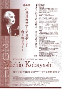 8/24から8/28まで 「第4回小林道夫サマーアカデミー in 下田」が開催されます。バッハのスペシャリストとして名高い小林道夫氏を講師に迎え、東京藝術大学バッハカンタータクラブ現役部員とOBの志願者を対象に、サマーアカデミーを開講します。期間中の全レッスンを一般公開し、最終日には、特別演奏会を行い、小林道夫氏と、ヴァイオリニストの桐山建志氏によるモーツァルトの名作ヴァイオリン・ソナタも披露されます。クラシツク好きにはお薦めのイベントです。チケット:<特別演奏会チケットのみの販売> ▼下田市民文化会館 ▼ヤマモト楽器店 ▼村上書店(本店) ▼クシダレコード店 ▼東急ストア ▼まりや書店(松崎) ▼プラスワン ▼尾崎書店(下賀茂) ▼ハイキャット(稲取) ▼方々書房(河津) ▼ムラカミ書店アネックス店 ▼マックスバリュ伊豆下田店応募・参加要項特別演奏会 前売チケット発売!※公開レッスンの聴講希望者は、文化会館窓口でご予約ください駐車場:110台(無料) 台数に限りがあるため、できるだけ徒歩または公共交通機関をご利用下さい■特別企画 小林道夫ピアノ講座(公開レッスン)24日 13:00~18:00聴講料 1,000■サマーアカデミー(公開レッスン) 8月25日(木)~27日(土)25日 14:00~18:0026日 10:00~12:30/14:00~18:0027日 10:00~12:30/14:00~18:00*公開レッスン・リハーサルの聴講は文化会館窓口で予約が必要一日券(特別演奏会チケット含まない)1,500円、全日程券(特別演奏会チケット含む)5,000円■特別演奏会/8月28日(日) 開場13:30 開演14:00チケット2,000円(全席自由)主催・共催・後援など:主催/東京藝術大学バッハカンタータクラブOB会 共催/(財)下田市振興公社お問い合わせ先:下田市民文化会館 TEL:0558-23-5151Webサイト:下田市民文化会館