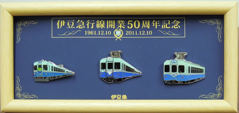 伊豆急行線開業50周年記念ピンバッジコレクションが発売中です。このピンバッジコレクションは、平成23年12月10日(土)に伊豆急行線が開業してから50周年を迎えることを記念し企画した商品で、伊豆急行線内の一部列車内のみにて特別限定発売をいたします。種類は、「伊豆急100系」・「伊豆急2100系(リゾート21)」・「伊豆急200系」・「伊豆急8000系・ED2511」の全4種類で、各種類とも、記念台紙に電車型のピンバッジが3種類収まっております。ほぼ今月一杯で販売を終了する予定です。お早めにお求めください。販売列車■特急踊り子号<上り>伊豆急下田12:00発→伊東12:54着(踊り子108号)伊豆急下田13:05発→伊東14:03着(踊り子110号)伊豆急下田15:01発→伊東15:55着(踊り子116号) <下り>伊東10:45発→伊豆急下田11:43着(踊り子105号)伊東11:48発→伊豆急下田12:49着(踊り子107号)伊東13:48発→伊豆急下田14:47着(踊り子115号) ■リゾート21(8/3~16 8/19~25 8/27~31のみ販売です)<上り>伊豆急下田10:16発→伊東11:24着伊豆急下田14:39発→伊東15:43着 <下り>伊豆高原9:15発→伊豆急下田10:00着伊東12:37発→伊豆急下田13:54着伊東15:57発→伊豆高原(8000系)16:20着