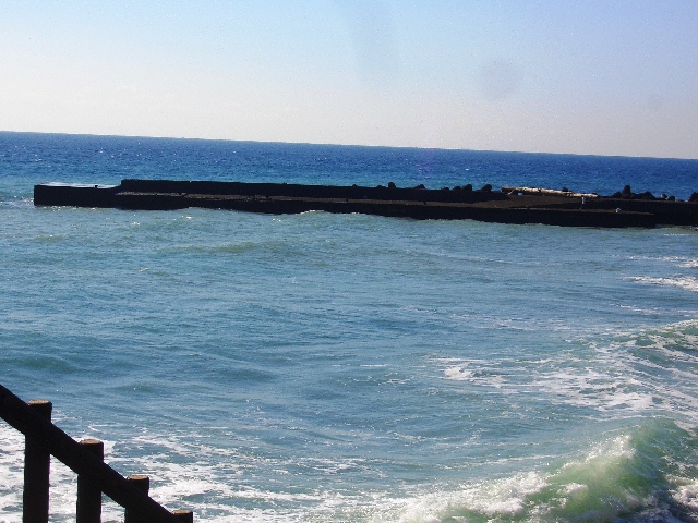今日はとても気持ちよく晴れています。少し風があるのでうねりはありますが、海もとてもきれいに見えています。ところで、堤防には先日の台風で流れついた巨大の流木が・・・いったいどうしたもんですかね?