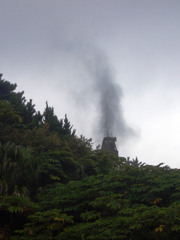 台風が近づいているので海岸の様子を確認にいったところ、崖の上の源泉で源泉井の清掃を行っていました。普段は櫓の下部で自噴している温泉を受けている器?をどかすので、上空に向けて温泉が吹き上がっています。でも写真ではちょっとわかりにくいですね。