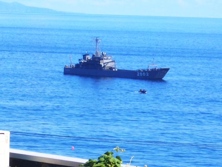 熱川の海岸に自衛隊?の艦船が!ボートも出てきて堤防のそばまで来ていました。台風の為中止になった海上避難訓練の代わりでしょうか?