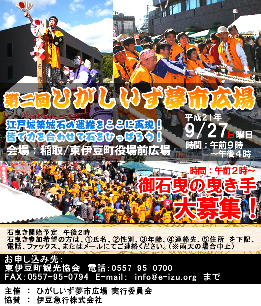 9月24日(土)第4回ひがしいず夢市広場が開催されます。■とき:平成23年9月24日(土)■時間:午前8時~午後3時■場所:稲取漁港 特設会場 ※雨天中止■内容:御石曳、青空市、スチールパン、道灌太鼓、海童太鼓、よさこい、ミニ電車、大道芸、働く車体験乗車、特捜警備隊イズセイバー、湊の朝市同時開催※御石曳の曳き手参加者募集中です(先着200名)■お問い合わせ:東伊豆町商工会 TEL:0557-95-2167 第2回のときの広告です