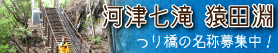このたび河津七滝に新たな名所が誕生しました。踊り子歩道の新たなルートとして、猿田淵と釜滝を結ぶ新遊歩道が開通し、全国的にも珍しい吊床板形階段のつりばしが完成しました。これを記念して、この吊り橋の名称を全国的に募集いたしております。◇応募方法 官製はがきにて郵送◇応募期間 平成23年7月1日から平成23年12月31日消印まで有効◇郵送場所 静岡県賀茂郡河津町笹原72-12河津町観光協会内 河津七滝吊り橋名称係まで◇記載事項 * つりばしの名称(ふりがな)と理由 * 応募者の住所、氏名(ふりがな)、連絡先電話番号◇選考方法 翌年平成24年1月の七滝観光協会役員会にて選考◇入選 最優秀の方には、七滝観光協会所属の宿泊施設のペア招待券(無料)と商品券、応募者の中から100名様に七滝オリジナルストラップを差し上げます。入選者はお電話にて、ストラップ当選者は商品の発送を持ってお知らせいたします。◇問い合わせ先 河津七滝観光協会事務局まで TEL 0558-35-7187当日の午前10 時から午後5 時まで、それ以降は翌日ご連絡ください。(応募期間中限定)