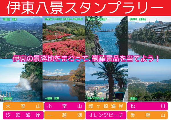 10月1日(土)~2月29日(水)城ヶ崎海岸・大室山・小室山・一碧湖・松川・汐吹海岸・オレンジビーチ・巣雲山など伊東の景勝地・伊東八景をまわって、豪華景品を当てよう!伊東八景スタンプラリーが開催されます。?応募期間:2011年10月1日(土)~2012年2月29日(水)?受付窓口:市内の伊東観光協会観光案内所(伊東駅前・伊東マリンタウン伊豆高原旅の駅ぐらんぱるぽーと)?応募要綱:期間中に指定場所のスタンプ6個以上集め、市内最寄りの伊東観光案内所にて応募してください。?景品:スタンプの数に応じて抽選で、伊東八景グッズ・伊東温泉の特産品など豪華景品が当たります。★伊東八景プレミアム賞(プレミアムスタンプ3ヶ所を揃える) 伊東八景グッズ+伊東温泉ペア宿泊券 5本★伊東八景コンプリート賞(伊東八景全てのスタンプを揃える) 伊東八景グッズ100本 又は 伊東八景グッズ詰合せ+ひもの詰合せ10本★六景賞(伊東八景の中から6~7個のスタンプを揃える) 伊東八景切手シート180本 又は 伊東八景切手シート+伊東名産品20本★参加賞(伊東八景の中から3~5個のスタンプを揃える) 伊東八景クリアファイル 先着2,000名様(なくなり次第終了)?引き換えは市内観光案内所(伊東駅前・伊東マリンタウン・伊豆高原旅の駅ぐらんぱるぽーと)で可能です。 ※営業時間 9:00~17:00 年中無休(1月1日は除く)?当選発表:抽選は3月10日頃、抽選結果は景品の発送をもって代えさせていただきます。?スタンプの置いてある場所 スタンプ押印場所及び指定施設の営業時間・休業日については、市内観光案内所または各施設にお問合せください。?応募用紙は、伊東八景スタンプラリー からどうぞ!