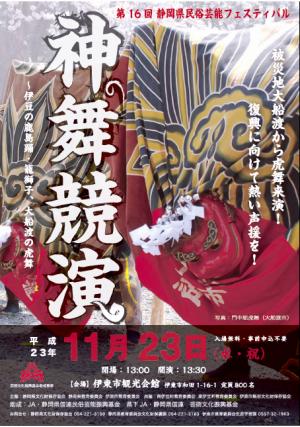 11/23(水)に伊東で第16回静岡県民俗芸能フェスティバルが開催されます。開催日:2011年11月23日(水・祝)開催時間:開場:13:00 開演13:30会場:伊東市観光会館(伊東市和田1-16-1) -伊東市料金:入場無料・事前申込不要駐車場:なぎさ公園内「なぎさ観光駐車場(有料)」にお車をお停めください。徒歩約5分。神の舞競演~伊豆の鹿島踊・籠獅子、大船渡の虎舞~ 南・東伊豆の特徴的な民俗芸能である「鹿島踊」「籠獅子」の上演を行います。さらに、今回、岩手県大船渡市の「虎舞」が出演します。東日本大震災の復興に取り組む三陸の皆さんに熱い応援を送りましょう。現在、復興支援の募金を受け付けています。募金受付窓口は「静岡県文化財保存協会事務局」(電話番号054-221-3159)です。詳細はお電話でお問い合わせください。また、当日も会場で募金活動を行います。主催・共催・後援など:静岡県文化財保存協会、静岡県教育委員会、伊東市教育委員会お問い合わせ先:静岡県教育委員会 TEL:054-221-3183