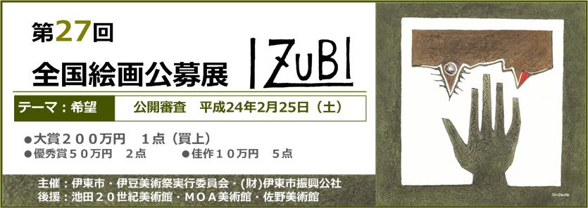 第27回 全国絵画公募展 IZUBI の応募要項を配布中です。開催日:展覧会期:2012年3月15日(木)~3月29日(木) 応募期間:2011年11月1日(火)~2012年1月25日(水)開催時間:9:00~17:00予備日:応募受付:H23.11.1~H24.1.25 公開審査:平成24年2月25日(土)9時から料金:公開審査:無料展覧会:大人900円 高校生700円 小中学生500円応募・参加要項応募要項配布中住所・氏名・連絡先・要項請求枚数を明記し、必要部数の返信用切手を同封の上、事務局(〒414-0024 伊東市和田1-16-1)までご請求願います。※要項1部120円分の切手 2~3部140円分の切手 4~5部200円分の切手「IZUBI」は新しい意欲に燃えた魅力あふれる絵画を全国から公募し、何よりも作家の自由な創作を尊重した極めて公平でユニークな公開審査を行います。「IZUBI」は、すぐれた作品を一堂に展観し、人々の心に潤いと豊かさを培い、絵画の世界に新風を巻き起こしたいと願っております。応募資格:創作活動を続けるすべての人テーマ:希望後援:池田20世紀美術館・MOA美術館・佐野美術館審査委員長:日夏露彦審査委員:村松秀太郎・重岡健治・谷川晃一・遠藤彰子出品点数:1人1点 出品料:7,000円大賞1点 200万円(買上) 優秀賞2点 各50万円 佳作5点 各10万円主催・共催・後援など:主催:伊豆美術祭実行委員会・(財)伊東市振興公社・伊東市お問い合わせ先:全国絵画公募展IZUBI事務局 TEL:0557-37-7135会場:公開審査:伊東市観光会館ホール 展覧会場:池田20世紀美術館 -伊東市