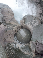 伊東市東松原町のハワイアンカフェ「マカマカ」に、伊豆半島ジオパーク構想のジオサイト(地質的な見どころ)をモチーフにした新メニューがお目見えしました。その名も「伊豆ロコモコ ポットホール」です。同店は今年1月にも「大室山オムライス」を開発し、商品化しています。都甲均美支配人(57)は「食を通して伊東の魅力をどんどん発信していきたい」と意気込んでいます。 ポットホールとは、巨岩のくぼみの中で石が何百年もの間、波に転がり続けて周りの岩を丸く削り取った珍しい造形です。伊東市の城ケ崎海岸には日本最大級と言われる直径約70センチの「かんのん浜のポットホール」(市指定天然記念物)があります。城ケ崎海岸のかんのん浜のポットホール 新メニューは、ポットホールの中にある球体の石を、すりごまやのりで覆った丸いおにぎりで表現。ご飯の中には地場産のアジの干物などが入っていて、おにぎりの上からかつおだしを注いで雑炊風にして食べる。当面はパーティーメニューの一つとして提供していくという。 都甲さんは「以前からポットホールを何らかの形にして商品化したかった。今後、ジオサイトを解説する資料を店内に掲示するなどして、地産地消とジオパーク構想をPRしていきたい」と話しています。問い合わせはマカマカ<電0557(35)9377>(木曜定休)へ伊東市のハワイアンカフェ「マカマカ」に新メニューがお目見えです