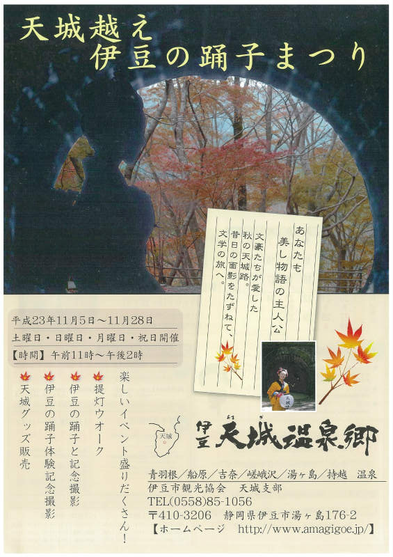 11月5日~28日までの土曜・日曜・月曜・祝日の計13日間です。イベント当日は、旧天城トンネル北側にて、伊豆の踊子がお客様をお待ちしております。一緒に記念撮影はいかがですか?また、提灯の無料貸出もしております。旧天城トンネルを提灯をもって、あるいてみませんか?雨天の場合は中止となります旧天城トンネル周辺の紅葉は11月中旬あたりです。天城の紅葉を体感していただけたらと思っています。皆様のお越しを心よりお待ちしております。 詳細
