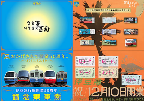 平成23年12月10日(土)に、伊豆急行線が開業してから50周年を迎えることを記念し、「伊豆急行線開業50周年記念乗車券」が発売されています。二つ折りの記念台紙の中には5枚の硬券乗車券が入っており、色もそれぞれ違うカラフルな特別仕様です。まさに「50年に一度」の記念きっぷ!鉄道愛好家の方も、地元の皆様も是非お買い求めください。2,000部限定です!名称 伊豆急行線開業50周年記念乗車券 発売期間 平成23年12月10日(土)~平成24年3月31日(土)まで 発売箇所 伊豆急行線各駅(伊東駅は除く)およびイベント会場 発売金額 800円(税込) 内容 城ヶ崎海岸 → 伊豆高原 160円 硬券乗車券 片瀬白田 → 伊豆熱川 160円 硬券乗車券 今井浜海岸 → 伊豆稲取 160円 硬券乗車券 今井浜海岸 → 河 津 160円 硬券乗車券 蓮 台 寺 → 伊豆急下田 160円 硬券乗車券 記念台紙付き(A4サイズ 二つ折り)