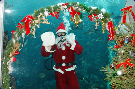 12月25日(日)まで下田海中水族館で水族館のクリスマスイベントとして、サンタクロース姿のダイバーによる餌付けショーが行われています。開催日:2011年11月19日(土)~12月25日(日)開催時間:9:00~16:30(閉館1時間前までに入館)料金:入館料/大人1900円、小人1000円駐車場:200台(無料)伊豆の海の生物館「シーパレス」でクリスマス特別展示を行います。サンタクロースの衣装のように赤白模様のシロボシアカモエビ、体の中央に赤と白の模様が走るアカシマシラヒゲエビなど、美しい色をした海の生物を展示します。また、伊豆近海に生息する約45種の生物が観賞できる水深6メートルのペリー号大水槽で、サンタ姿のダイバーによる餌付けショーが行われます。餌付けショーは12月25日まで。平日は1日1回、土日・祝日は3回開かれます。ダイバーとの記念撮影もできます。お問い合わせ先:下田海中水族館 TEL:0558-22-3567会場:下田海中水族館 -下田市アクセス公共交通機関をご利用の場合伊豆急下田駅より、定期バスで約7分または徒歩で約25分お車でお出かけの場合・東名沼津I.Cより天城峠、河津経由で下田へ ・東名厚木I.Cより熱海、伊東、河津経由で下田へ地図を開く