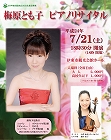 伊東市出身のピアニスト 梅原とも子さんが地元でリサイタルを開催します。開催日:平成24年7月21日(土)開催時間:18時30分 開演料金:大人2,000円 高校生以下1,000円(全席自由)チケット発売開始日:2012/05/23チケット:(財)伊東市振興公社・伊東市内各コミュニティセンター・伊東市生涯学習センター荻会館駐車場:駐車スペースに限りがあります。市営駐車場(有料)をご利用ください。演奏予定曲目ショパン :スケルッツオ第2番ドビュッシー:月の光シューマン :ソナタ第3番 他ゲスト 小澤麻里(ヴァイオリン)【梅原とも子】4歳からピアノを始める。北中学校、伊東高校から東京音楽大学器楽専攻(ピアノ)に進学。同大学大学院音楽研究科器楽専攻鍵盤楽器研究領域を修了。日本クラシック音楽コンクール、ロゼピアノコンクール等 様々なコンクールで入賞。東京、静岡など多数の演奏会に出演。【小澤麻里】神奈川県立小田原高等学校卒業。第16回日本クラシック音楽コンクール高校の部で全国大会へ進み、入選。東京音楽大学在学中に第5回横浜国際音楽コンクールアンサンブル部門室内楽一般の部で演奏賞受賞。小学校4年生より、伊豆フィルハーモニー管弦楽団の団員として、毎年定期演奏会に参加。また、同オーケストラの定期演奏会にてソリストとして共演。 現在、東京音楽大学大学院音楽研究科器楽専攻弦楽器研究領域2年に在学中。主催・共催・後援など:主催:(財)伊東市振興公社・伊東市お問い合わせ先:(財)伊東市振興公社 TEL:0557-37-7135会場:伊東市観光会館ホール -伊東市地図を開く拡大