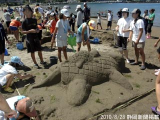 富士山をのぞむ志下海岸で、市内の子ども会から子ども達が集まり、縦6メートル、横3メートルの砂のキャンパスにコテやほうきなど思い思いの道具を用いて自由に作品を作ります。作品は、完成品の出来ばえ、アイデアやチームワークなどから評価され表彰されます。子どもたちの創造力でどんな作品ができあがるのでしょうか?開催日 : 2013年6月9日(日)開催時間 : 9:00~14:00予備日 : 雨天順延/6月15日(土)料 金 : 入場無料<日程>9:00~ 9:20 受付9:30~10:00 開会式10:00~10:15 清掃10:15~12:15 砂の造形活動並びに審査12:15~13:30 昼食、自由行動、作品見学13:30~14:00 閉会式(審査発表、講評、表彰)主催・共催・後援など:沼津市教育委員会・沼津市子ども会育成連絡協議会お問い合わせ先:沼津市生涯教育課 TEL:055-934-4871会場:志下海岸 -沼津市地図を開く