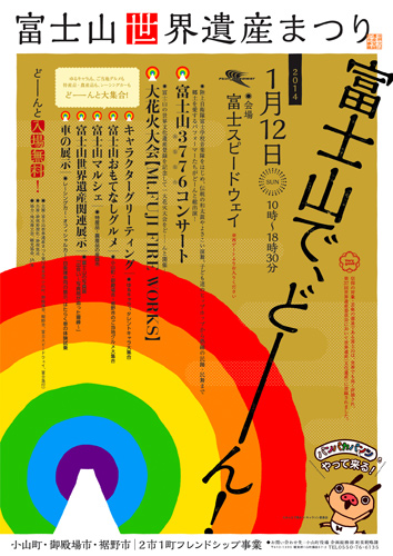 Enjoy the Yosakoi dance performance or Japanese drum , the children , civil dance of skill , such as people dance " Fuji 3776 Concert" , fireworks , luxury prizes is " 3776 tournament gift " ※ lottery ticket . Direct marketing City of specialty products and agricultural products to hospitality at your local gourmet of Oyama-cho , Gotemba , Susono character loose to set " character greeting " , " Fuji hospitality gourmet " , " Fuji Marche " , photo exhibition of Mount Fuji of four seasons many events such as " Fuji world Heritage -related exhibition " will be implemented .Sunday 10 am to 6 :30pm January 12 : date and time( Free admission from West Gate ) Square event : Venue: Fuji SpeedwayFee: Free admissionYes Parking : parking . Admission is free .Contact: Oyama Town Hall Planning Affairs Department mayor strategy Division 0550-76-6135Web site : Oyama-cho official site " Mount Fuji World Heritage Festival"Venue: Fuji Speedway - MishimaAddress 〒 410-1308 Oyama-cho Nakahinata 694TEL 0550-78-1234