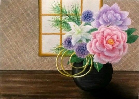 お正月が近いので、久々に和風のイメージでソフトパステル作品を描いて
