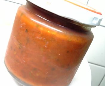 一滴の汁も無駄にしないように、まな板を使わず、鍋の上で、手にトマトをもって、包丁でいきなりざく切りです。皮の近くに栄養たっぷりということなので、皮もつけたまま使いました。味に深みを出すために、友人がイタリアでかってきてくれたセミドライトマトもはさみで切って加えました。乾燥バジルはたっぷりと。味付けは跳梁のチキンコンソメとクレージーソルト。できあがったのは150g瓶に1本半。少ないですね。