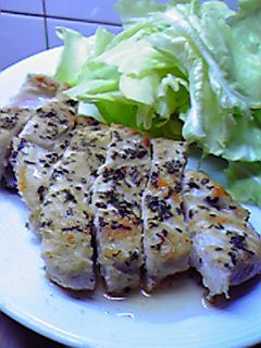 鶏胸肉1枚の厚い部分に包丁を入れ、全体の厚さを均等にする。ここがポイントです。塩を胸肉にちょっと多めにかけ、すり込むようにして揉み込みます。これにイタリアンハーブミックを両面にたっぷりかけ、グリルで皮目から焦げめがつくくらいに焼きます。ちょっぴり焦げた部分がまたおいしいですよ。お皿に切って盛りつけ、キャベツをたっぷり添えてできあがりです。