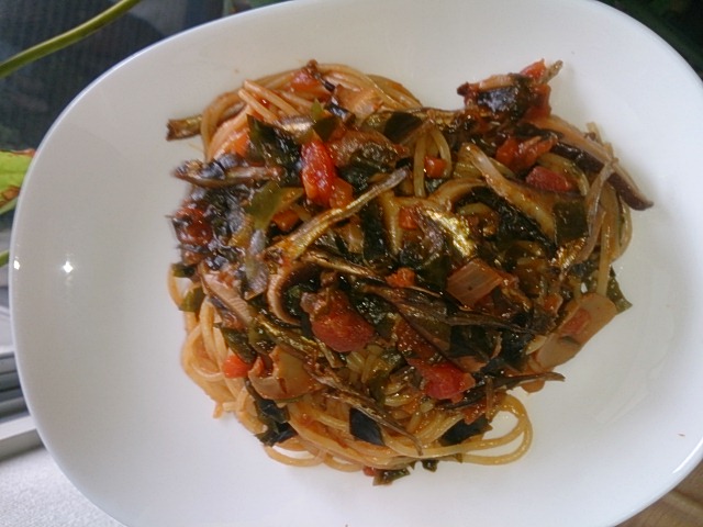 <材料一人分>小さい煮干し(塩無添加食べる小魚)・・・頭をとって7g乾燥わかめ・・・大1干し椎茸・・・1枚トマトソース・・・100gスパゲティ・・・80g黒酢・・・大1オリーブオイル・・・少量溶けるチース・・・軽くひとつまみ<作り方>煮干しに黒酢をかけてやわらかくしておく。(30分くらい)乾燥わかめはもどしで、細かく切る干し椎茸ものどして薄い千切りに。フライパンに、戻した煮干しを酢と共に入れ、わかめ、椎茸も加えて酢がとぶまでから煎りする。オリーブオイル少量を加え、炒めて、塩こしょうで下味をつける。トマトソースと麺のゆで汁を加え、あたたまったら、ゆであがったスパゲティを加え、絡め、チーズもくわえて、全体になじんだらできあがり。 <感想>黒酢と煮干し、わかめがトマトによく合います。正直想像以上です。乾物イタリアンの料理レシピ