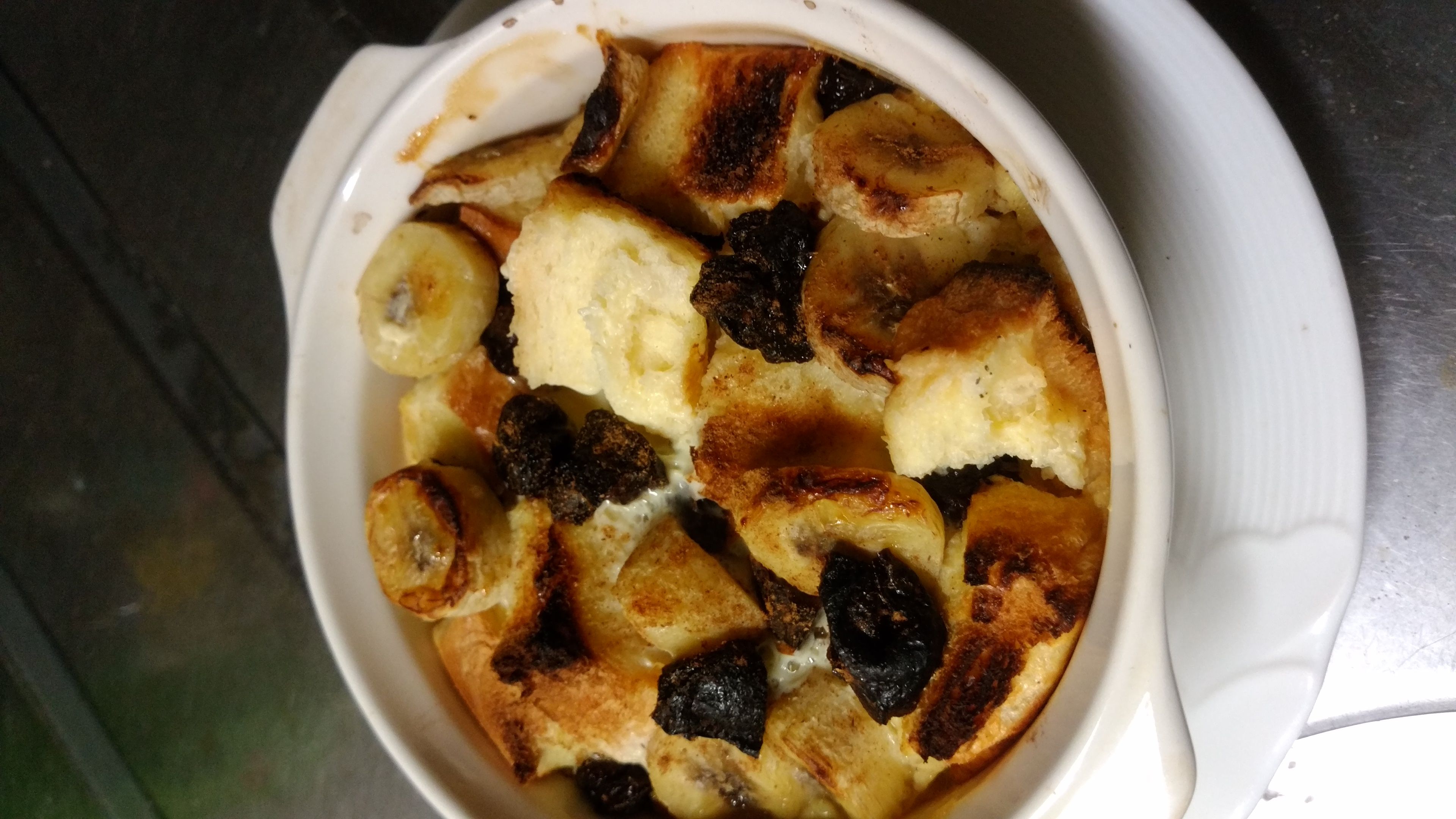 1人分あたり食パン(6枚切)1枚プルーン(柔らか大粒プルーン)3個バナナ半本卵1個牛乳120cc蜂蜜小さじ1シナモン少々食パンはトーストしてから、9等分し、グラタン皿にならべる。プルーンは1個を4-6にきり、バナナは薄切りにして、パンの上にならべる。卵、蜂蜜をよくまぜ、牛乳を加えて混ぜ合わせ、パンの上にかける。シナモンを振りかけ、900Wのオーブントースターで10分焼く。途中焦げそうなら、アルミホイルをかぶせます。ちょっと寒くなってきた季節の日曜日のブランチに、もってこいです。