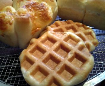 この週末のパンはかなりうまく焼けました。成型には問題ありだけど。水種を前の晩に仕込み、あともう少し膨らませて・・・と思っていたら、すっかりわすれちゃって、そのまま寝てしまい、朝まで放置してしまいました。すっかりしぼんでしまっていたけれど、あわてて冷蔵庫で寝かして。心配しながら本捏ねしましたが、大丈夫でした。HBでのこねもパッタン、ペッタン勢いよく捏ねることができました。どうも今までのパンはHBに対して粉量が少なすぎたのか、水分が少なすぎたようです。いろいろな種類が作りたくて、今回は5種。プレーンな食パン、ブルーベリージャム入り、ぬれ甘納豆入り、チーズ、ワッフルです。ワッフルとてもかわいい!見た目だけは市販品と同じです。ちょっと、いろいろ練習してみようかしら。私が使っているのは、3000円くらいの、1台3役のメーカー。1万円くらいの有名メーカーのとまよったのだけれど、これでいいかとやすい商品を買いました。できあがったばかりのワッフルを見た息子がパクリ。「パンと同じじゃん」。壮です。パン生地をワッフルメーカーで焼いただけですから、You are right!せっせと食べて、またつくらなくっちゃ。作り方は一つの生地でパン5種アレンジ一つで使い道いっぱい! 1台3役『マルチホットサンドメーカー トリオ』ホットサンドメ...母のこと ・・・ 年をとると赤ちゃんにもどっていくのでしょうか。母がデイサービスで、食事中に寝てしまい、持っていたコップからお茶をこぼしてしまった男性の型の話をしていました。実は母もその3日前にお昼ご飯を食べる、食べないといっている最中に突然寝てしまい、気がついたらベッドにいたと言っていました。本人は、ネタのではない、意識を失ったのだと言い張っていますが。でもまた夕べ夕食のとき、醤油ラーメンが食べたいというので、食べてもらっているうちに、何か動きが止まっている。声をかけると目をつむったまま、眠くて目が開けていられないとiuのです。ソファーで寝てしまわれては、とても運ぶことが出来ないので、一生懸命声をかけ、なんとかベッドまで移動してもらいました。赤ちゃんって、そういうこと有りますよね。老人は赤ちゃんにもどっていっているのでしょうか。