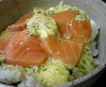 ノルウエーサーモンいただきました。頭の方で730g。かなりの大きさでした。ありがとうございます。いきなり全部はたべられないほどなので、まずは半分にきって、半分は冷凍庫で出番待ちです。生でいただけるということなので、まずは刺身として使う料理を考えてみました。そこで漬け丼にしてみました。材料/ノルウエーサーモン(背の方)適量、醤油大1,レモン汁小1、ねっとり長芋6cm、卵黄1個、青のり小1.5、白だし小0.5~1作り方/サーモンは5mm程度の薄切りにして、醤油とレモン汁に30分ほどつける。ねっとり長芋をすりおろし、卵黄と白出汁をいれてよく混ぜる。さらに青のりをいれて、よくまぜる。温かいご飯を丼にもり、とろろをかけ、上に漬けサーモンをのせ、できあがり。このノルウエーサーモンは、うまみが濃いですね。さらに脂のりもとてもよく、醤油につけるとパッ-と脂が広がりました。ねっとり永芋は青森の物ですが、普通の長芋より粘りが強く、山芋に近い感じです。長芋だとサラサラしすぎますし、山芋だと粘りが強すぎて、出汁で薄めなくてはいけないのですが、ねっとり長芋は単にすり下ろすだけで、あとは醤油か白出汁で味付ければ、ちょうどの粘り具合になります。食の細い母も、ぺろりと完食してくれました。<a href="http://www.recipe-blog.jp/special/2009/10/r091013a.html" target="_blank">レシピブログの、「ノルウェーサーモン」を使った美肌にいいレシピへ参加中♪</a>
