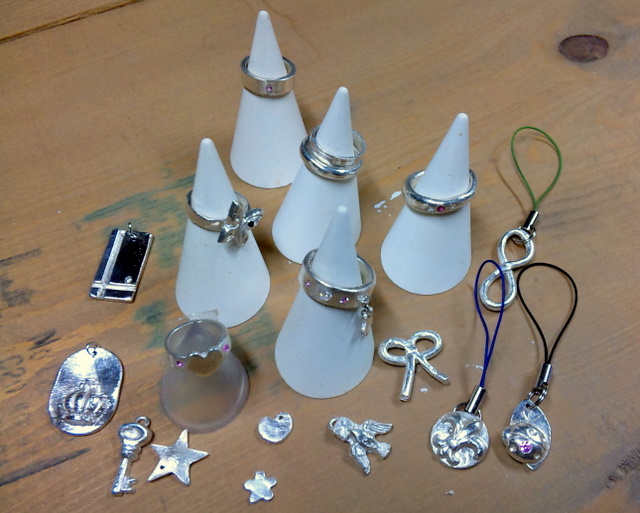 昨日の体験のお客様は、なんと10人。女子大生さんたちの10人のグループ、卒業の記念ということでした。女の子が10人もいると、華やかで、賑やかで、楽しくて\(゜ロ\)(/ロ゜)/YOSITOさんも楽しそう、いや忙しそうでした。ペンダントトップやストラップ、それにリボン!?あ、リボン可愛い。リボンもあったのね。 そしてそして、リングが7本!(右から2番目が2本です。)こんなにたくさんできました。石も入れたり、ブラさがってるタイプもあったり、皆さんとっても個性的に仕上がりました。楽しんでもらえてほんとによかったなぁって思います。田舎でのんびり手作り体験工房銀のシルバーアクセサリー体験教室