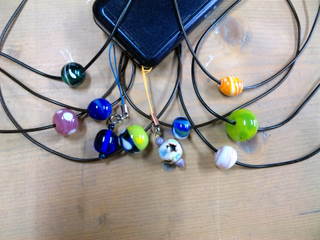 今日の体験のお客様はひと組4名様チョーカーが8本、ストラップが2個できました。大勢おられるとカラフルですね。ガラス細工のアクセサリー、小さなガラス細工工房銀のとんぼ玉体験教室
