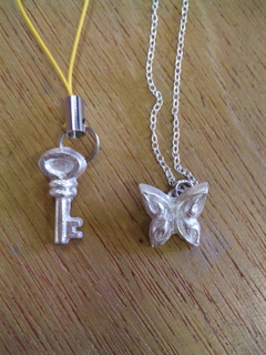 今日の体験教室のお客様は、ふた組3名様。男性お一人と女性お二人のふた組でした。前から銀粘土が気になっていたという男性、蝶々のペンダントと鍵の形のストラップ。お上手でとても早く出来上がりました。ぜひまた、工房のほうで大作にチャレンジしてください。もうひと組のお二人は、普通サイズとちっちゃめのペンダントを2個ずつ。大き目のほうには石も入ってます。お二人とも二つのペンダントを重ね着けで、身に着けて帰ってくださいました。お似合いでしたよ。田舎でのんびり手作り体験工房銀のシルバーアクセサリー体験教室