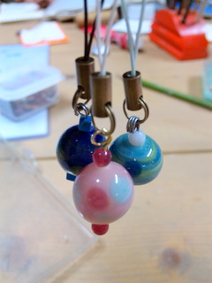 ふた組めのお客様は、女性お二人。とんぼ玉体験をされました。ピンクのおいしそうな、携帯ストラップとクールな色あわせのおしゃれなチョーカーの出来上がり。 ガラス細工のアクセサリー、小さなガラス細工工房銀のとんぼ玉体験教室