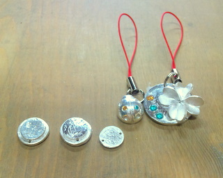 おとといの体験のお客様は、ひと組2名様。仲良しカップルさんでした。四つ葉のクローバー、てんとう虫、あまりでできたボタンです。四つ葉のクローバー、すご~くかわいい。ちょっとおしゃれなオリジナル携帯ストラップもできますよ。銀とガラスのアクセサリー教室工房銀