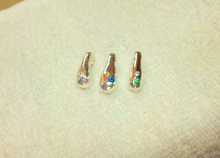 おとといの体験のお客様は、ひと組3名様。男性お一人、女性お二人でした。両手に花っていうより、やっぱり男性押され気味?しずく型のペンダントトップが3つ出来上がり。同じようにつくっても石の位置や色、雫の形がそれぞれ違ってみんなオリジナル。素敵ですね。