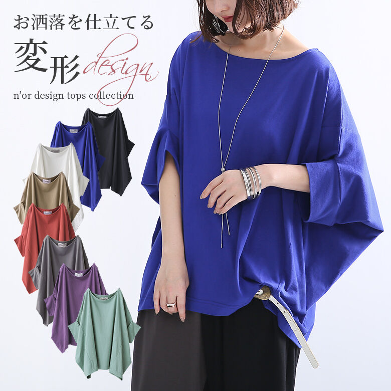 『n'OrLABEL変形デザインドルマンカットソー』[カットソー レディース 春夏 トップス 五分袖 七分袖 ドルマンスリーブ 綿100% コットン100% ドレープ 変形 コクーン ボートネック]※メール便可※【10】