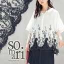 <br>『somari imaginationレース×刺繍シャツブラウス』[シャツ ブラウス 春夏 レディース トップス 半袖 五分袖 綿100% フレア フリル スカラップ 刺繍 レース袖 配色 ボタニカル柄]<br>※メール便可※【10】