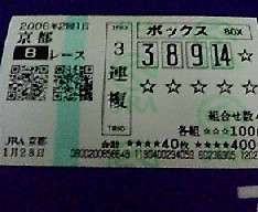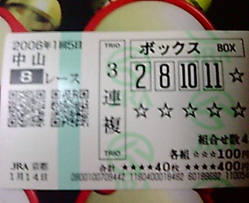 この4日間、4重賞だけで万馬券が14本も飛び出すという波乱の幕開けとなり、私は4つとも全くかすりもしませんでした。今週末から通常開催に戻って、まず今年の重賞をゲットしたいものです(出来れば、凄い配当のを)。私の4日間はというと5日は早朝から京都競馬場へ行き、今年の始めである中山1Rをゲット出来れば縁起がいいぞと買うがダメ、そしたら京都1Rやと買うと、これまたダメ、その内、何か当たるやろうとレースは進んで行くが馬券の方は、ダメダメダメダメダメ・・・・・・・・・・・・・!結局、究極の全敗!7日は午後からスタート、今日は謙虚に、まず1勝する事を考えて始める、そして遂に今年の初勝利を京都7R3連複4690円をゲットし、勝負レースである京都9R馬連1520円もゲットする事ができ、この日は±ゼロでした!8日も午後から始め、この日は京都7Rという早い内に勝負レースがあるので、外すと後半が苦しくなるぞと思いながら馬券を購入、しかし幸先よく馬連8690円をゲットする事ができ、逆に後半が凄く楽になったわとレースが進んで行くと、今度は馬券の調子ではなく、立って入られなくなる位、体調が悪くなり早く全レース終わってくれと思いつつ馬券を購入していた。この日は中山12R馬連550円も取り、結構プラスで終わる。9日は昨日の無理がたたり自宅で購入、昨夜が熱で殆ど眠れなかったこともあって、競馬を見ながら寝てばかりで、ひどい時はスタートまで起きていてもゴールの瞬間は爆睡している始末であった。それでも勝負レースである京都9Rだけは真剣に購入したが全くダメでした。この日は京都10R枠連3300円と12R3連複1060円を取り、惜敗で済みました。この4日間の結果は全体の回収率が133%勝負レースの回収率が240%でした。この4日間はいろいろありましたが、今の所プラスなので良いスタートを切れたという事にしておきます。また今日も1クリックお願いします。