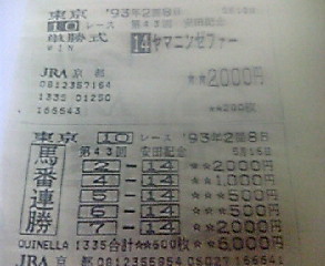昨年の暮れに大掃除をしていると、ある1枚の馬券のコピーが出てきて、うわぁ~懐かしいなと思ったので私が競馬に嵌ってしまった事を書いてみようと思います。競馬を始めたばかりで、あまり良く分からない時に一人で京都競馬場へ行くと(一人で行くのは始めてでした)当時、野球をしていたチームメイトにバッタリ会ってお互いビックリしました。その後、その友人と毎週、競馬をするようになるが、私は全然ダメなのに対して友人は良く高配当の馬券を取っていたので、もう競馬に向いてないから辞めようかと思っていた頃に初万馬券が当たったんですよ!その時のコピーがこれです(かなり古いので黄ばんでます)。93年の安田記念ですヤマニンゼファーとイクノディクタスで決まり6-14で馬連68970円でした。(この馬券で自転車と髭剃りを買いましたよ)これをキッカケに、この年は人が変わったみたいに当たるわ!当たるわ!で自分にどうしたんと問い正すぐらいに当たって、この年のG1は16戦13勝と今では考えられません。私は93年の安田記念がなかったら、競馬をやっていなかったかもしれません。たった1つのレースで、これだけ嵌ってしまうとは思いもしませんでしたよ。番外編:私は競馬で大勝ちをすれば、何か少しでも物に 変えるようにしていますが、みなさんは どのようにしていますか? 今日も1クリックにご協力お願いします。