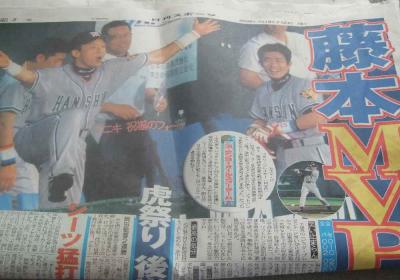 こんにちは~!日刊スポーツの藤本はこんな感じでした おいおい、藤本より金本の方が目立ってるやないか~当の本人はというと 赤星の股の下かいな~ほんまyumi...9さんが怒るで~日刊スポーツも、もうちょっと考えてくれなアカンわ、MVPやで、藤本が小さ過ぎるやんか~