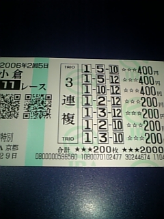 小倉記念の予想と今日、競馬場へ行った結果です小倉記念G3 自信度:B◎ 4番コンゴウリキシオー○ 1番メイショウカイドウ▲10番サイレントディール△12番スウィフトカレント× 3番ヴィータローザ買い目 3連複BOX 1.3.4.10.12 以上10点明日はこの予想で行ってみようと思います。続いて今日、京都へ行き10レース参戦しました、結果は10戦5勝でした万馬券も1つゲットしましたよ、1-2-12の3連複をゲットしましたその喜びも今日の野球の結果で全て吹っ飛んでしまいました今日も必死の声援ご苦労様でした、選手にはまだ伝わってないみたいですね、あ~あ、ウサギは負けるし最悪ですね、早く2007年にならないかな~
