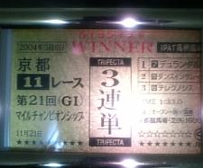 おはようございます~!ファン感の事は、一昨日書きましたが、言い忘れてたので一言だけ今年は甲子園での最後の行事まで観戦出来て本当に良い1年でした今日は、これから12月から働く会社へ書類等を貰い、色々説明等も聞きに行きますこれだけなのに少し緊張気味で情けないです競馬の事ですが、忘れてました○○四○○さん、○○ゅ○○さんの所にコメントを書いて結果日記も書いた気分になってました遅れましたが、昨日の結果ですマイルCS G1 自信度:A◎10番ダイワメジャー1着○16番シンボリグラン3着▲ 3番プリサイスマシーン6着△ 7番ダンスインザムード2着★ 4番ロジック17着☆15番マルカシェンク12着× 6番カンファーベスト10着× 5番テレグノシス11着× 1番コートマスターピース7着アタリでした、久しぶりのトリプルゲットでした私の買ってた3連単の中では1番安い配当で、しかも100円でのゲットなので、来週に繋がっただけです続いて鉄人予想です京都3-7-10-16東京3-11-13-163連単10-16-3 10-16-7 10-16-4 10-3-16 10-7-16 10-4-16こっちも当たって16000Pプラスです、どこまで順位が上がったかが楽しみですそれでは1日遅れで今日は、これでカンパ~イ 今週末は○ン○ンさんが一発大きいのを当てそうな気がします