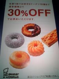 おはよう~!先週、お好み焼き屋のサイコロで割引きがあることを書きました結果は6の目が出て10%引きだけでしたそれも転がして少しでも楽しめば良いのに友人が上からポトンと落とし、1回跳ねただけでピタッと止まり、何それというような内容で、私が「ちゃんと転がせよ」と言うと、友人は「知らんやん」と言葉を返しただけで終わってしまいましたまあ、美味しかったから良かったのですが、自分でサイコロを振らなかったのが少し悔いが残っています今日はミスドへ3時のおやつのドーナツでも買いに行こうと思っていますこれも割引き券を頂いたんですよこちらは10個まで30%引きという券です この券が6枚付いてるのを前回行った時に頂きました