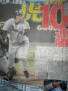 2-0濱中の1発鳥谷の好プレーで勝利しました今日の勝ちで昨日の久保田・球児が打たれて負けた事も全て忘れる事の出来る試合でしたさあ、これで明日も、この勢いで勝ちますよ昨日、今日のパワフルな応援したので、本当に疲れましたよ今日は6回ぐらいに腹筋がピクピク動いてましたもちろん明日もパワー全快で行きますもう、こうなったら、あと4試合持たそうなんて思ってません、行ける所まで突っ走るだけです倒れたる~~~~~今日は、水分摂り過ぎで飯要らんはよ、風呂入って寝ます絶対に5連勝するよ~~~
