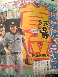 今日は4-1で勝利しました。久々の2桁安打で快勝でした。感想は久々に下柳の消える魔球が炸裂した感じでしたね、テレビで見た訳じゃないのではっきりした投球内容までは分かりませんがスライダーが手元で切れてたように感じました。もう1つは矢野の2塁打で3点目が入ってホッとしました、今日の試合の流れからして2点差で球児なら大丈夫という感じでした。あと残り試合も14試合です、選手の皆さんこんな感じで日替わりヒーローでお願いします。月末の甲子園まで勝ち続けて下さい。それで9月29日甲子園最終戦で中日に4,5ゲーム差つけましょう!私の観戦も5月か6月の弱い時期に行けるだけ行ったるとブログで書いてから、あと甲子園5試合+?試合まで漕ぎ着けました。何とか、実行出来て本当に良かったです。(何試合観戦したかはトップページ参照して下さい)出来る事なら、ご褒美としてペナントレース制覇の瞬間を生観戦させて欲しいです。最後まで頑張って応援するので、選手の皆さんよろしく、お願いしますm(__)mはぁ、今日も疲れた!