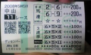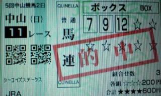あぁ、今日は全くダメでした、、、有馬記念、2,3着入れ替わってくれてたら、??万円勝ちやったのに、、、もうショックが大きすぎやわ、、、アドマイヤモナーク3着付け、いっぱい持ってたのにまさか2着に来るとわ、、、アドマイヤモナーク2着で持ってる馬券はマツリダゴッホとの馬連だけ、、、もうガックリでした、、、今日の京都は10度もあって、あまり寒くなかったです、、、人が多くて馬券買うの大変やったけど・・・今日はモッケンさん京都へ来てたんやね、、、携帯電波が入りにくい1階に居たのでメールに気づきませんでした、、、すみません、、、KWさんとは京都でバッタリ2年ぶりにあったよ、、、もう、ヤケクソやから明日は園田へ行きます、、、もし坊主でブログに現れんかったら、死んだと思っといて下さい、、、あっ、馬券道場も全然ダメでした、、、一番惜しかったのはエアシェイディの3着でした、、、また来年も生きてたらチャレンジします、、、来年は帽子にピンバッチやで、、、今年は結局7段でした、、、では、さよなら、、、良いお年を。。。