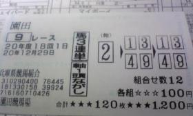 今年もあと7時間を切りましたね、、、そば食って、紅白見て、カウントダウン見て、終了ってとこでしょうか???今年は野球も競馬もブログも、最低な結果となった感じがします、、、来年はこの中の一つでもいいから良い事があればいいかな、、、来年の目標は、競馬:回収率100%、馬券道場8段、、、野球:甲子園観戦30試合、関東遠征初勝利、、、仕事:日々進化、、、これで行きたいと思います、、、では、来年もよろしくお願いします。。。元旦の競馬:新春盃(名古屋) 8.9-1.2.3.4.11門松賞(荒尾) 2.8-1.5.6.7.10